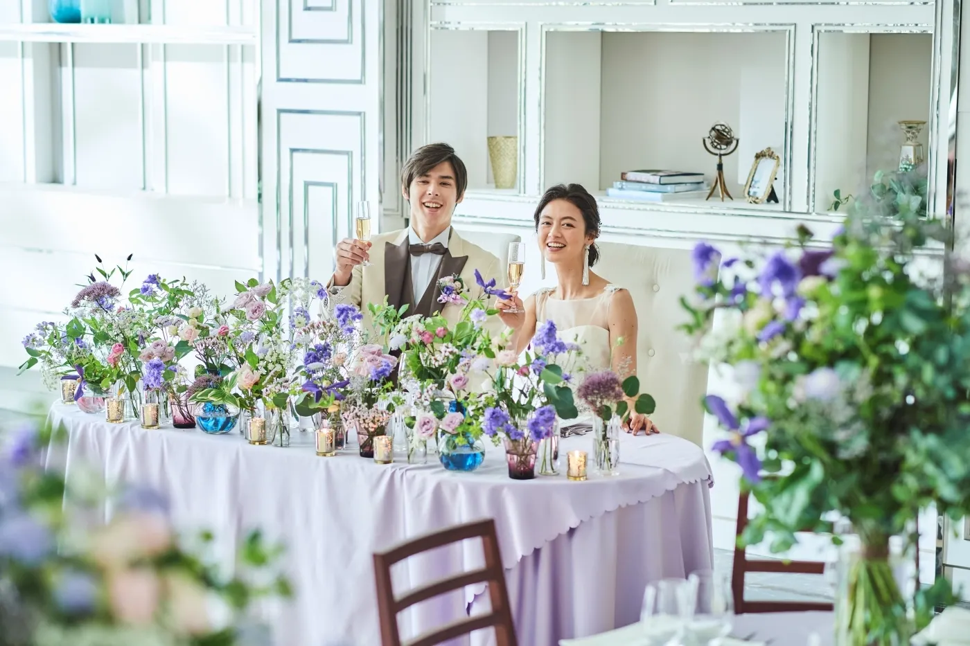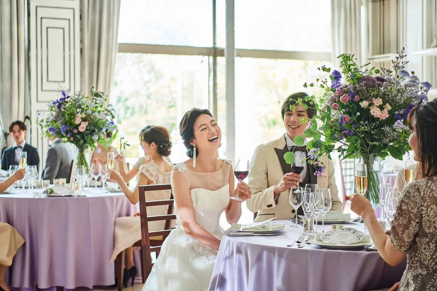 シャンデリアの煌き、ガーデンの花や緑を臨むガラス、大理石の床が巧みに融合されたパーティー会場。